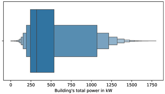 Furthermore, Figure 6 shows the letter–value plot for the total power consumption of the building. It was discerned that the median was around 300 kW and that half of the total observations were distributed at 300 kW and below; meanwhile, the remainder of the total observed values were allocated between 300 kW and around 1750 kW.