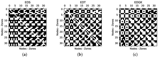 A matrix with dimensions was created, where each element is the spatial distance between zones i and j, which is calculated by Equation (6) and deals with the Euclidean distance in three-dimensional space, as is depicted in Figure 1. The matrix is then scaled (Equation (4)) in space [0,1]. A filter, i.e., the threshold value , is applied to the matrix elements, where only the values lower than the threshold are kept. The adjacency matrix is computed according to Equation (7).