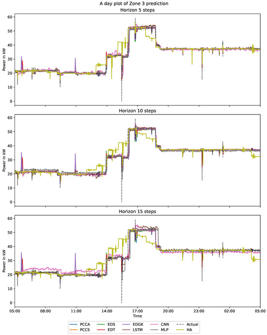 Additionally, as shown in Figure 12 and Figure 14, the predictive accuracy of the various models and time horizons for power forecasting at both the zone and building levels was evident. It was apparent that the proposed models exhibited a high level of consistency with the actual curve when compared.