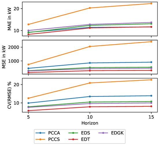 In contrast, Table 2 presents the building-level power consumption forecasted performance metrics for the forecasting models across different prediction horizons (5, 10, and 15), and the metrics are plotted in Figure 13. The metrics include the mean absolute error (MAE), the mean squared error (MSE), and the coefficient of variation of root mean squared error (CV(RMSE)). Additionally, Figure 14 depicts the predicted and actual values of the building’s total consumed power.