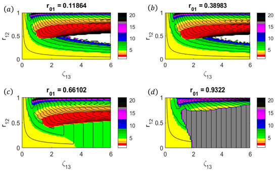 Isolines of the maximum value of the dimensionless growth rate computed from Equation (9) as a function of eyewall vorticity ratio and primary eyewall thickness . The minimum isoline value is , and the contour interval is 0.05. The color shading indicates the azimuthal wavenumber associated with the most unstable mode where the white color indicates the stable region. For each panel, , , , , and .