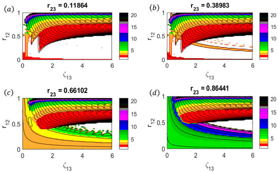 Finally, Figure 7 examines the impact of primary eyewall thickness , eyewall vorticity ratio , and secondary eyewall thickness on the stability of the vortex. Notice that large and small (i.e., thick primary eyewalls) lead to a stable vortex regardless of . As shown in Figure 7a,b, increasing above 0.7 (which corresponds to thin primary eyewalls) excites Type-3 BI for small values of . As shown in Figure 7c,d, Type-1 BI is excited within the parameter range and , which corresponds to strong secondary eyewalls. In contrast, for , Type-2 BI is excited for and , as shown in Figure 7a–c. In general, when the primary eyewall dominates (which occurs when ), changes in secondary eyewall thickness do not impact the dynamics except for very thin secondary eyewalls (i.e., when ). This describes the transition from Type-2 BI to Type-1 BI.