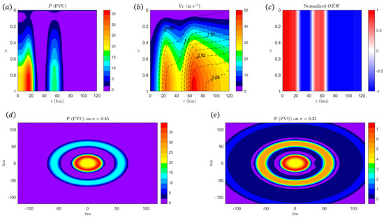 Figure 8a shows that the azimuthal-mean PV maximizes at due to the increased static stability above the surface. As shown in Figure 8d,e, the PV of this vortex exhibits a double hollow tower structure with elevated PV associated with the primary eyewall, a well-defined moat region, and a region of elevated PV associated with the secondary eyewall. The normalized Okubo–Weiss parameter shown in Figure 8c is defined as follows: