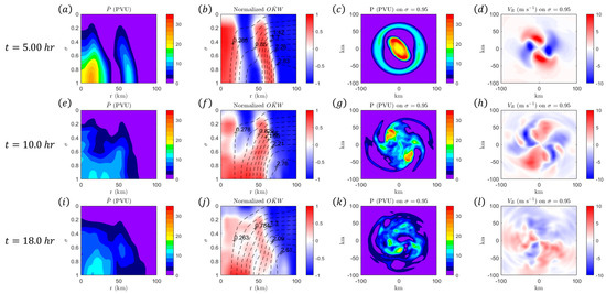 The evolution of the vortex for Vortex III at (top panel), (middle panel), and (bottom panel). (a,e,i) show the azimuthal-mean PV (in PVU where ). (b,f,j) show the azimuthal-mean-normalized Okubo–Weiss parameter with isosurfaces of absolute angular momentum (in units of ). (c,g,k) show the PV on . (d,h,l) show the radial velocity on .