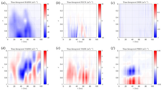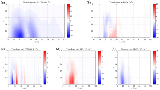 where is the absolute angular momentum; is the azimuthal component of dissipation; and corresponds to an azimuthal average. The terms on the right-hand side of Equation (20) correspond to the radial transport of absolute angular momentum by the mean flow (RADM); the vertical transport of absolute angular momentum by the mean flow (VADM); flux divergence of angular momentum by the eddies (FLUX); the vertical transport of absolute angular momentum by eddies (VADE); the eddy azimuthal pressure gradient force (PRES); and the torque due to forcing from subgrid-scale diffusion (DISS), respectively. To show the net changes in during the onset of Type-2 BI for this vortex, Equation (20) was integrated from through (which corresponds to the time interval in which the area-integrated palinstrophy rapidly increased) using the trapezoidal rule on 15 min resolution model output.