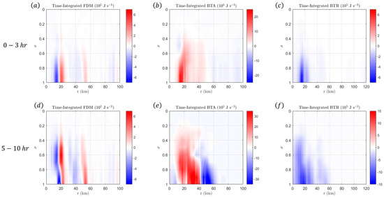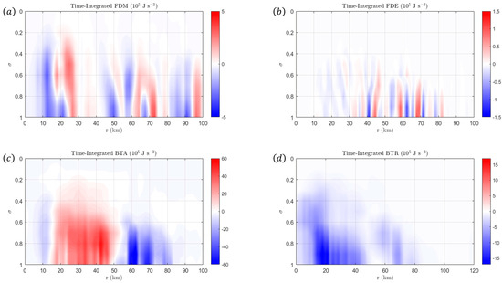 where is the eddy kinetic energy (per unit mass), , , and are the radial and azimuthal components of diffusion, respectively. The terms on the right-hand side of Equation (21) correspond to the flux divergence of by the mean flow (FDM); the flux divergence of by the eddies (FDE); the barotropic energy conversion from the mean vortex that is associated with the mean azimuthal flow (BTA); the barotropic energy conversion from the mean vortex that is associated with the mean radial flow (BTR); baroclinic energy conversion from the mean vortex associated with the mean flow (BCC); the conversion of eddy potential energy into kinetic energy (PTC); and the dissipation of eddy kinetic energy by diffusion (DISS), respectively. To show the net changes in during the onset of Type-2 BI for this vortex, Equation (21) was integrated from through (which corresponds to the time interval in which the area-integrated palinstrophy rapidly increased) using the trapezoidal rule on 15 min resolution model output.