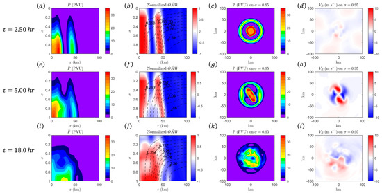 The evolution of the vortex for Vortex II at (top panel), (middle panel), and (bottom panel). (a,e,i) show the azimuthal-mean PV (in PVU where ). (b,f,j) show the azimuthal-mean-normalized Okubo–Weiss parameter with isosurfaces of absolute angular momentum (in units of ). (c,g,k) show the PV on . (d,h,l) show the radial velocity on .