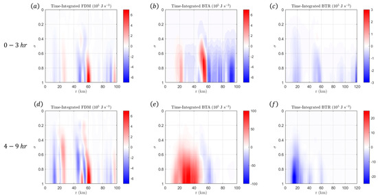 Figure 12 shows the net changes in induced by the dominant terms in the budget analysis. First, it should be noted that the dominant source of eddy kinetic energy is the barotropic energy conversion from the mean azimuthal flow (BTA), as shown in Figure 12c. Physically, this means that the mean vortex transfers kinetic energy to the eddies through the mean azimuthal flow. In contrast, barotropic energy conversion from the mean radial flow (BTR) is a major sink for the eddy kinetic energy [as shown in Figure 12d], which means that the energy source for the radial flow shown in Figure 9 originates from the barotropic energy conversion from the eddies. Furthermore, since BTA and BTR are both major sinks of eddy kinetic energy near the secondary eyewall, this implies that VRWs transfer their kinetic energy to the mean vortex in this region, consistent with the analysis given in Figure 11. As shown in Figure 12a,b, the flux divergence of by the mean flow (FDM) and by the eddies (FDE) play a secondary role in the energy budget. However, near the primary eyewall, FDM is a source of eddy kinetic energy, indicating that the flux divergence of eddy kinetic energy from the mean vortex transports eddy kinetic energy inward from outside the primary eyewall. Conversely, FDM is a sink of eddy kinetic energy near the secondary eyewall, which suggests that the mean vortex damps eddies near the secondary eyewall.