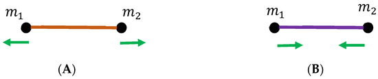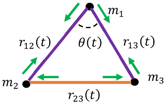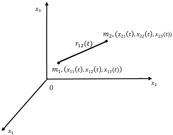 The Cartesian coordinates of the point masses and are and , respectively; the first index denotes the number of the particle, and the second index denotes the number of the Cartesian coordinates (see Figure 1). The time-dependent distance between the point masses is given using Equation (1):