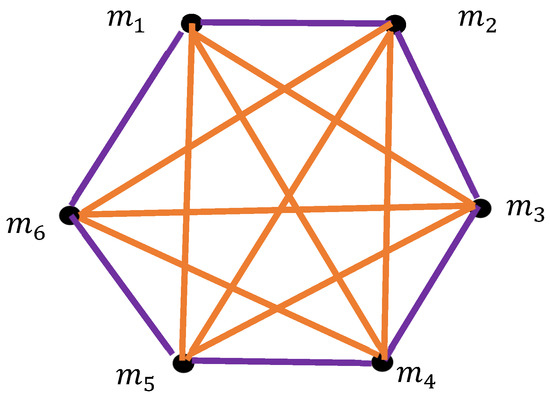 Now, consider an infinite but countable system of moving material points/particles . The particles form the vertices of an infinite bi-colored graph. The vertices/particles are connected with an orange link when the particles move away from each other/remain at the same distance in the course of their motion (in other words, Equation (2) is true). The vertices/particles are connected with a violet link when the particles converge (Equation (3) is correct). Figure 7 represents a graph corresponding to the instant photo of the motion. According to the infinite Ramsey theorem, an infinite monochromatic (violet or orange) clique will necessarily appear in the graph [13,29].