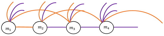 We adopt the following coloring procedure: if the particles and move away from each other or remain at the same distance and Equation (2) applies, they are connected with an orange link (they are “strangers” in the terms of the seminal “party problem” of Ramsey theory [10,11,12,13]), and when the particles converge and Equation (3) holds true, they are connected with a violet link (they are considered, respectively, “friends” [10,11,12,13]), as shown in Figure 2.