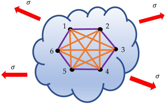 Figure 8. Six points labeled located within the deformable body are depicted. Stress is applied. Points are displaced under the deformation, and the color of the links connecting the points is established using Equations (2) and (3). Monochromatic orange triangles and are recognized in the graph. . If the points move away from each other or remain at the same distance, they are connected with an orange link; when the points converge, they are connected with a violet link.