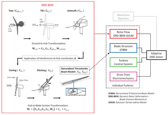 28] and subsequently validated using the NREL-5MW-RWT and other turbines as benchmarks. This new multiphysics suite was given the name of the Common ODE Framework (CODEF) and has the ability to account for the dynamic responses of wind turbine blades. CODEF’s aeroelastic module, called the Dynamic Rotor Deformation–Blade Element Momentum (DRD-BEM) model, also ensures that any changes in the blade geometry due to deformation, which affect blade section attitude versus the incoming flow, are accounted for dynamically. Some general details regarding the algorithmic structure of CODEF will be given in