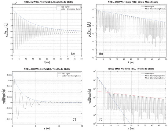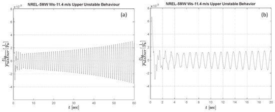 Figure 12a shows the NBD signal for a time period long enough to appreciate the unstable condition in the long term, visually manifested in the expanding nature of the signal’s peaks.