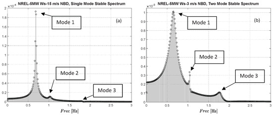 An interesting point observed in all cases that have been tested, which could also be seen in the examples shown, is the different levels of excitation of the secondary oscillatory modes, in particular Mode-2. These levels of secondary-mode excitation may vary depending on the combination of parameters (Ws, TSR, pitch) of each case and are visually manifested as higher-frequency fluctuations of relatively lower amplitude mounted on top of the low-frequency oscillations of the largely dominant Mode-1. As mentioned in