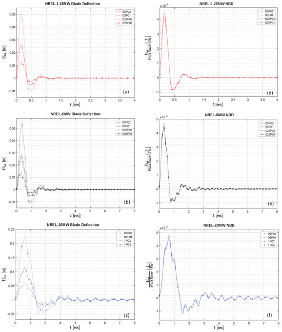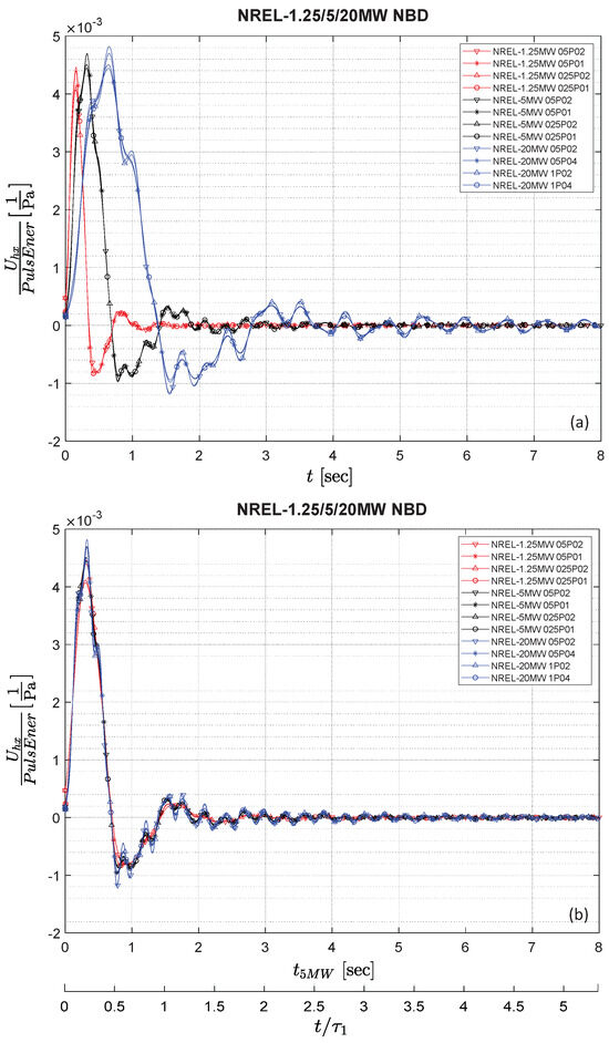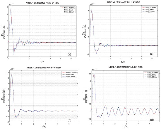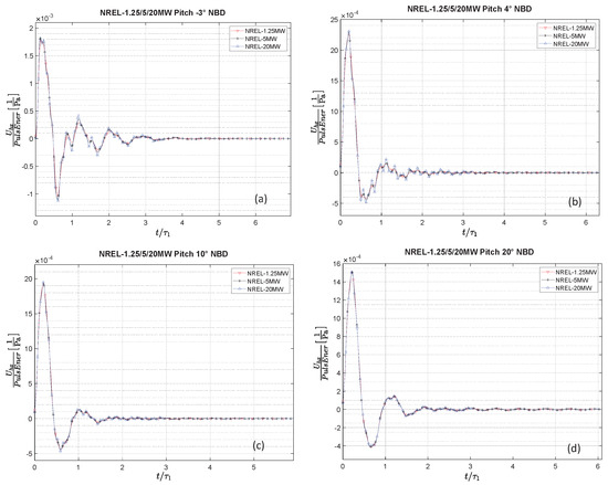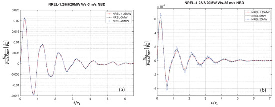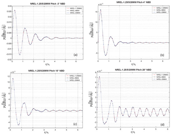 These two ideas led to the study described in this article. Here, the oscillatory decay behavior of the NREL-5MW-RWT, along with one up-scaled and one down-scaled variation of 0.5× and 2× scaling factors, respectively, was further investigated. These two scales were chosen in particular because, when applied to the original NREL-5MW-RWT design, they cover the typical range of sizes of commercial utility-scale wind turbines that are in operation today, as well as the ones that could be expected to enter into operation in the near future. The methodology for obtaining this universal non-dimensional ROC will be discussed in