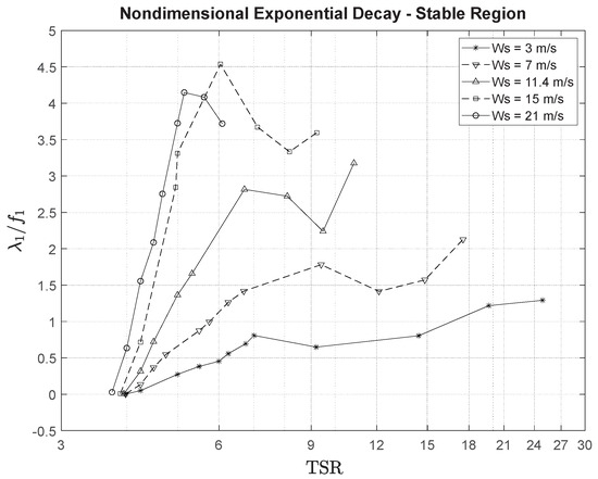 2], was that the exponential rate of decay of the NBD was found to be dominated by aerodynamic damping, and that it depends exclusively on the rotor’s operational conditions, given by the background wind speed, Ws, and the rotational regime, given by the TSR. Hence, the value of the exponential decay of the dominant mode,