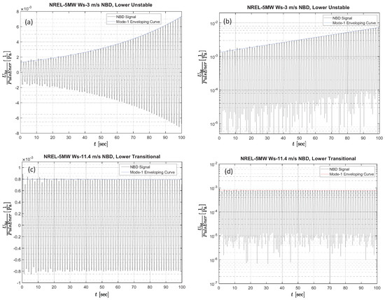 Figure 11 shows examples of NBD signals for an NREL-5MW rotor, illustrating the typical oscillatory behavior observed in the Lower Unstable Region (LUR) and the behavior observed in the Lower Transitional Boundary (LTB), which is the locus of operational conditions that separate the LUR from the stable region of operation.