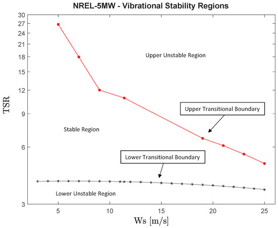 Figure 13 shows am example of a map of the stability regions for the NREL-5MW rotor, operating at a blade pitch angle of 0°, for different values of TSR and wind speeds covering the entire operational range of the NREL-5MW design. The loci of LUR, UUR, LTB, and UTB are indicated.