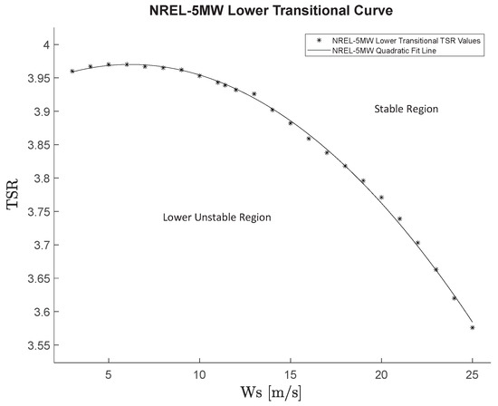 Figure 13, for the NREL-5MW rotor operating at pitch = 0° for different values of TSR and Ws. The plot shows the individual values of TSR vs Ws based on several numerical results obtained at the transitional conditions connected by a quadratic best-fit line.