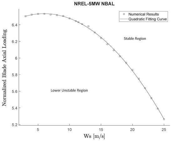 Figure 15 shows the values of NBAL vs. Ws for the NREL-5MW rotor operating at pitch = 0° and the values of TSR corresponding to the transitional operational conditions on the LTB. The plot shows the individual values of NBAL vs. Ws from several numerical results obtained at the TSR transitional conditions, connected by a quadratic best-fit line.