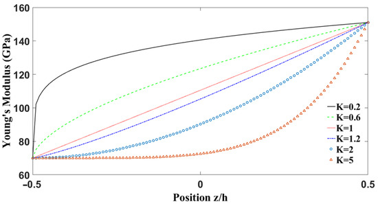 Figure 2 shows the variation of the modulus of elasticity of aluminum and zirconia ( FG shells with respect to the thickness for different power law indices. It can be seen that the Young’s modulus is smaller when the Ks are smaller.