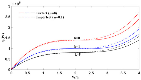 Figure 5 shows the nonlinear variation of the mechanical load q with respect to the dimensionless maximum deflection W/h for various power-law indices k = 0, 1, and 5. Both perfect (μ = 0) and imperfect (μ = 0.1) panel configurations are considered. The analysis showed that increasing the power-law index k led to a reduction in load-bearing capacity for the same deflection, indicating that higher k values, which correspond to softer material gradation in functionally graded materials, result in lower structural stiffness. Additionally, the presence of initial imperfections consistently decreased the structural capacity, with imperfect panels showing higher deflections under the same loading compared to their perfect counterparts. All the curves exhibited strongly nonlinear behavior, particularly for lower k values. This plot emphasized the significant role of both material gradation and geometric imperfections in the panels’ nonlinear mechanical response. Remarkably, as the volume fraction index increased, the response curves became less nonlinear and more stable, and the snap-through behavior transitioned into a smoother, more gradual response.