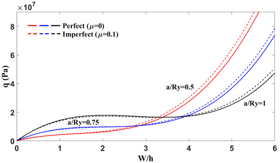 The nonlinear mechanical response of cylindrical panels shown in Figure 6 was examined by analyzing the variation of mechanical load q with respect to the dimensionless maximum deflection W/h for different length-to-radius ratios a/Ry = 0.5, 0.75 and 1, under both perfect (μ = 0) and imperfect (μ = 0.1) conditions. The results demonstrated that panels with lower a/Ry values (i.e., higher radius of curvature) become shallower and exhibit significantly higher stiffness and load-bearing capacity, as evidenced by the steeper rise in their load–deflection curves. On the contrary, increasing the a/Ry ratio led to a more flexible structural behavior and a smoother, more gradual nonlinear response. The presence of initial imperfections further reduced the structural stiffness across all cases, with imperfect panels consistently showing greater deflections under the same loading. Additionally, the snap-through response became less abrupt and more stable as the curvature decreased, highlighting the important role of geometric parameters and imperfections in the nonlinear performance of cylindrical panels.