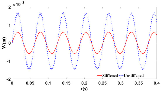 The nonlinear dynamic analysis of an eccentrically stiffened functionally graded material double-curved shallow shell subjected to a mechanical load is calculated. The shell is made of aluminum (Al) and alumina (Al2O2) and the stiffeners are made of alumina. Both longitudinal and transversal stiffeners are assumed to be identical. The nonlinear response is solved by using the fourth-order Runge–Kutta method with 3000 steps to reach convergence. Figure 7 below illustrates the nonlinear dynamic responses of stiffened and unstiffened spherical panels under sinusoidal mechanical excitation . The results showed that the unstiffened panel exhibited significantly larger vibration amplitudes, reaching nearly while the stiffened panel maintained displacements below . This substantial reduction in amplitude for the stiffened panel highlights the effectiveness of structural stiffeners in enhancing dynamic stability. Although both configurations demonstrated similar vibration frequencies, the overall response was distinctly nonlinear, particularly for the unstiffened panel. The findings emphasize the critical role of stiffening elements in reducing nonlinear oscillations and improving the structural integrity of spherical panels under dynamic loading conditions.