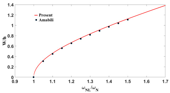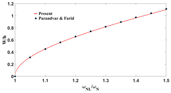 In order to validate the present solution technique, the results for nonlinear frequency–response obtained here are compared with previously published papers in this area. For this purpose, several examples are considered here. The first study was performed for a simply supported aluminum square plate with immovable edges. The so-called “backbone” obtained (frequency–amplitude curve of nonlinear free vibration) is compared with the one obtained by Amabili [38] as seen in Figure 8. The present results are in excellent agreement with the reference data from Amabili, confirming the accuracy of the developed model in capturing large-amplitude vibration behavior. The curve demonstrates a clear hardening-type nonlinear response, where the frequency increases with deflection due to geometric stiffening effects. For small deflections the plate exhibits linear behavior with . As the deflection increases to moderate levels ( W/h, the system transitions into a nonlinear regime characterized by in-plane stretching and increased stiffness. Beyond , strong geometric nonlinearity dominates, resulting in a frequency shift. This nonlinear stiffening is critical in the dynamic analysis of lightweight structural components, where neglecting such effects may lead to inaccurate predictions of resonance conditions and potential structural failure.