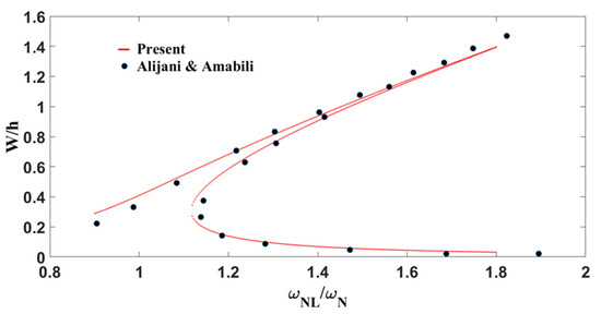 Next, the calculation of the amplitude frequency relationship for the same simply supported immovable FGM plate was carried out and compared to Alijani and Amabili [39]. Figure 11 shows the forced vibration frequency–response plot of . It can be seen that the present results are in good agreement with those of Alijani and Amabili. Similar nonlinear behavior and dynamic phenomena were observed for both the pure metal and the functionally graded material (FGM) cases.