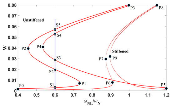 The points at which the motion changes its behavior, from stable to unstable and vice versa, are referred to as “Saddle-node Bifurcations”. P1, P2, P3, and P4 for the unstiffened spherical shell and P6, P7, P8, and P9 for the stiffened one are called bifurcation points. Table 7 shows the change of motion between two consecutive bifurcation points as well as the change of behavior. For the unstiffened curve in Figure 13, one can observe that, at some dimensionless frequency ratios (, five solutions exist theoretically (S1, S2, S3, S4, and S5). However, this is practically not possible.
