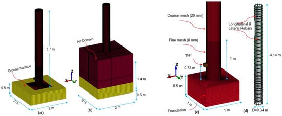 To accurately model localized damage, a multi-resolution mesh strategy is employed: Near the TNT and column surface, 8 mm fine meshes are used, while 20 mm vertical mesh spacing is applied to regions away from the primary impact area. A mesh density of 25 mm was used for the column foundation, whereas a 50 mm coarser mesh was assigned to the surrounding ground domain. This meshing strategy ensures computational efficiency while maintaining high accuracy. Figure 1a–c illustrate the geometry and meshing of the air blast model, including the ground surface, TNT, and the air domain used for the simulations. The internal reinforcement layout is depicted in Figure 1c,d showing the arrangement of longitudinal bars and lateral stirrups embedded within the concrete matrix.