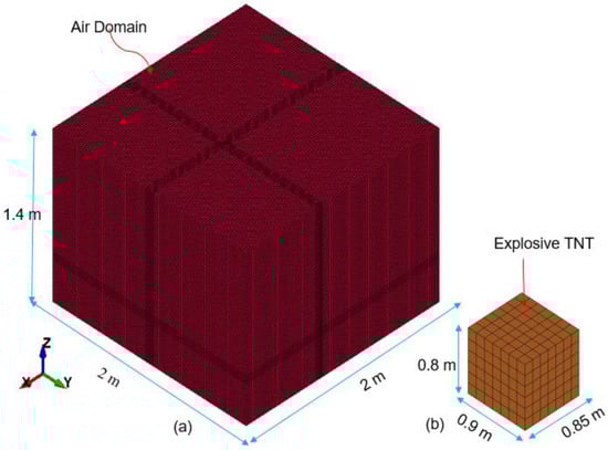TNT explosives are modeled using the Jones–Wilkins–Lee (JWL) equation of state and represented in LS-DYNA by the *MAT_HIGH_EXPLOSIVE_BURN formulation to simulate detonation behavior. Figure 2 presents the ALE solid meshing used for the air domain and TNT explosive elements.