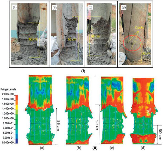 The numerical model is validated by comparing the damage profiles with the experimental results reported by [1,26]. A damage profile represents the extent of material damage, commonly used in numerical models to predict material failure under various loading conditions. Figure 4i presents experimental results from [1] for circular columns exposed to a 1 kg contact detonation. The observed failure pattern included pronounced surface-level compressive damage, with the affected region spreading about 60 cm along the specimen. Extensive damage was also recorded along the side faces, as shown in Figure 4(iia–iic).