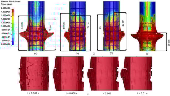 Figure 14 illustrates a representative case in which the height of the water surface varies, while the stand-off distance (R = 1.0 m), detonation depth (Z = 1.25 m), and TNT charge-weight (W = 0.40 kg) remain fixed. Specifically, in case 08 where Z = 1.25 m, the water surface aligns exactly with the RC column’s midpoint.