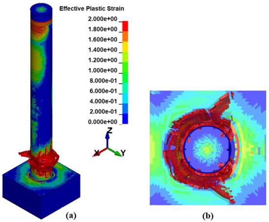 (i) Photographs of the tested RC column from multiple views, front (a), left (b), right (c), and back (d), (used with permission [1]), and (ii) simulated ALE results (used with permission [1]), including front (a), diagonal (b), side (c), and back (d) views. Plastic strain contours are depicted.