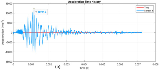 Figure 7a compares Yuan et al.’s [1] experimental acceleration time history with their numerical results, while Figure 7b presents the results from this study. The simulated and experimental acceleration results show strong agreement in peak values and overall response patterns. Yuan et al. [1] observed peaks of 12,769 m/s2 (experiment) and 13,788 m/s2 (simulation) in Figure 7a, while this study’s Sensor 3 measurement yielded a peak of 12,203 m/s2 (Figure 7b). The 4.4% deviation is likely due to differences in experimental setups, materials, and modeling assumptions.