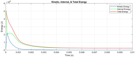 The red curve represents total energy, which remains nearly constant in the early stages as it includes both kinetic and internal energy. Over time, total energy decreases slightly, reflecting dissipation through heat transfer, radiation, and other mechanisms. This conservation of energy aligns with theoretical expectations for shockwave behavior.