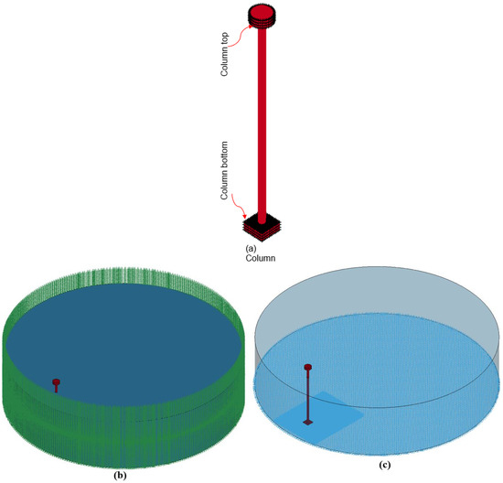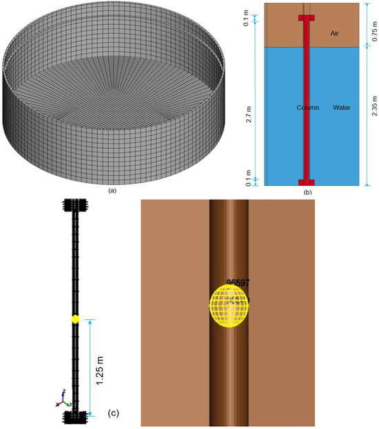 To enhance computational efficiency, the original water tank with a 10 m diameter and 3.1 m height is downsized to a compact cubic model measuring 3 m × 3 m × 3 m, as illustrated in Figure 13. This reduction preserves simulation accuracy while minimizing computational demands. This reduced model maintains simulation accuracy while minimizing computational demand. The 60 simulation cases presented in Table 6 systematically vary explosive weight, stand-off distance, and water depth to analyze their effects on RC column behavior.