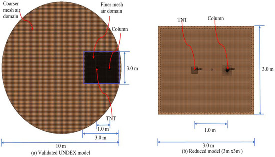 Validated and reduced models for parametric study. (a) The validated UNDEX model with the finer air domain shown in blue-black color; (b) the reduced model (shown in brown color).