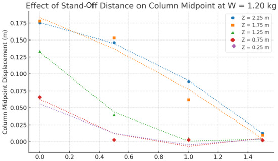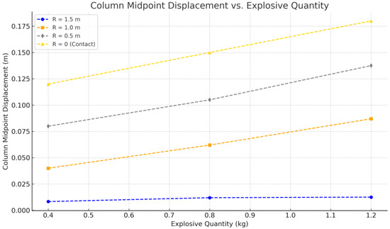 The study evaluates how stand-off distance (R), ranging from 0 m for contact explosions to 1.5 m for non-contact blasts, influences the column’s structural response. Figure 16 demonstrates a significant reduction in displacement as stand-off distance increases [34]. Note that the lines in Figure 16 represent exponential regression curves fit to discrete simulation data points (markers) to reflect the nonlinear relationship between stand-off distance and column displacement. Small deviations between markers and lines are expected due to curve fitting and do not indicate inconsistencies in the simulation results.