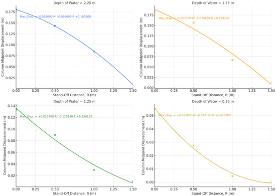 Trend in column midpoint response as a function of stand-off distance for an explosive charge of W = 1.20 kg. Note that each color represents a specific water depth, and ‘x’ markers denote the coordinate points used for polynomial fitting.