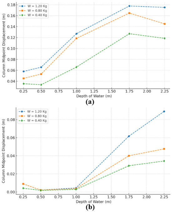 Column midpoint displacement under varying water depths: (a) R = 0 m (contact explosion); (b) R = 1.0 m (non-contact explosion).