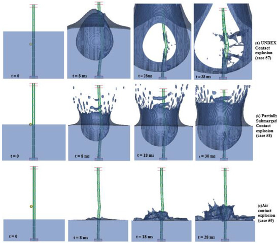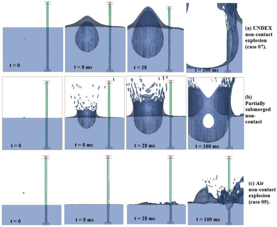 Non-contact explosion simulation results for (a) UNDEX, (b) partially submerged, (c) air explosions at specified time (t) intervals.