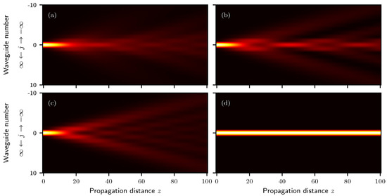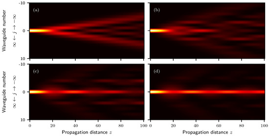 The intensity evolution of the field in an infinite waveguide array described by Equation (24) is shown for different functions when the central waveguide is illuminated; (a) corresponds to (25) with , (b) corresponds to (26) with the same parameter value, (c) represents (27), and (d) illustrates (26) again with .