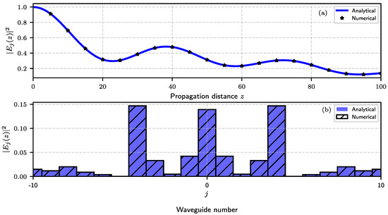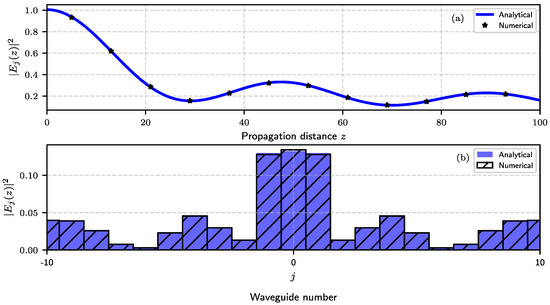 The numerical solution of the Schrödinger equation, using the Hamiltonian defined in Equation (2) is obtained in the limit and compared against the semi-analytical expression of Equation (26) with the parameter . Panel (a) illustrates the intensity evolution in the central waveguide along the propagation direction z; the solid blue curve represents the analytical result, while the black dots denote the numerical data. Panel (b) displays the intensity distribution at a fixed distance , where blue bars and black diagonal lines indicate analytical and numerical results, respectively.