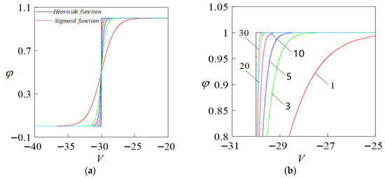 Based on the characteristics of Equation (5), and for the purpose of numerical simulation, distinct values = 1, 3, 5, 10, 20, 30 are selected when , as illustrated in Figure 1, is represented as a graph depicting the adaptation curves to the Heaviside function under varying values, where the black solid line represents the plot of the chemical synaptic model concerning the variable and the parameter , built by the Heaviside function, which is observed as a step function lacking smoothness; the model is further processed with smoothing corrections. The Heaviside function was smoothed using the Sigmoid function to obtain a modified model of a continuous and smooth chemical synapse, as shown in Figure 1b. The solid red line represents the chemical synaptic model’s curve at , revealing a significant deviation from the Heaviside function’s curve pre-adjustment. Altering the parameter revealed a steady rise in , enhancing the Sigmoid function’s suitability to the Heaviside function. Additionally, the discrepancy between the adjusted curve and its pre-adjustment counterpart diminishes progressively, and when , they nearly align, yielding an outstanding fitting outcome.