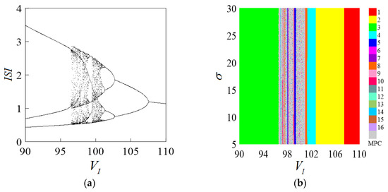 Numerical calculations show that the two-parameter interspike interval (ISI) bifurcation diagram for σ and is as shown in Figure 2b. It can be found that the parameter affecting the firing of the neuronal coupled system is only , which is further confirmed by comparing with Figure 2a. The variation process of the parameter is consistent with the single-parameter bifurcation, indicating that the parameter σ has no effect on the Chay neuronal system. According to the conclusion fitted by the Sigmoid function smoothing model, the value of σ is determined to be 10, and the parameter σ will not be further discussed.