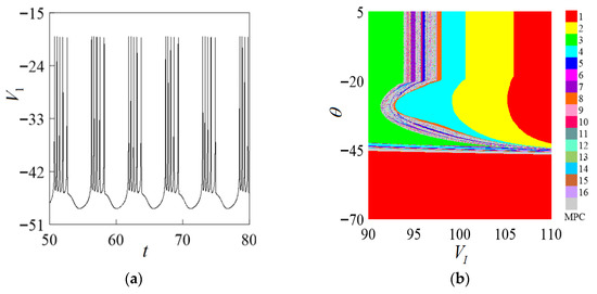 An external current is applied to the neuron system to excite I to make the neuron generate action potential. The discharge process of the membrane potential of the Chay neuron system evolving with time is obtained by numerical simulation. As shown in Figure 3, the system membrane potential fluctuates between to generate action potential. When , the neuron is in a resting state. Since the membrane potential varies between [−45, −20], the value of the synaptic threshold correspondingly varies between the intervals (−45, −20]. The two-parameter bifurcation is shown in Figure 3b. It can be clearly seen that when the value of changes between the intervals (−45, −20), the changes in the values of other parameters will not cause changes in the discharge rhythm, which further confirms that the synaptic threshold is . The value range is (−45, −20).